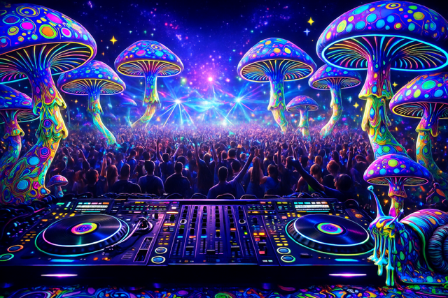 The image above shows a vibrant psychedelic music festival scene viewed from behind a DJ deck. Giant glowing mushrooms tower over a huge crowd of dancing people, while colourful lights, lasers, and stars fill the night sky. The whole scene feels energetic, magical, and immersive — like stepping into a dreamworld rave.